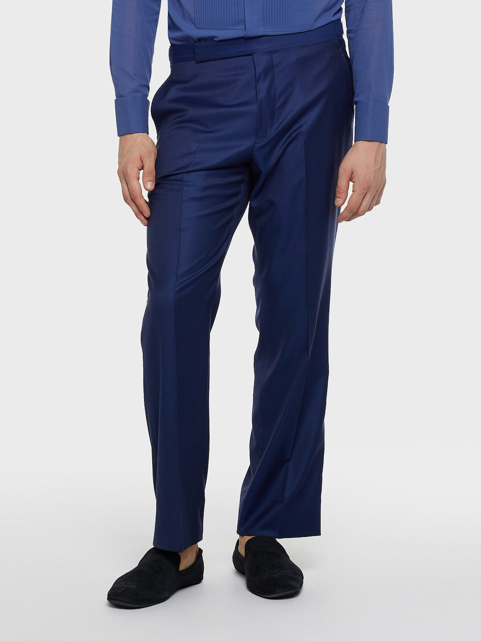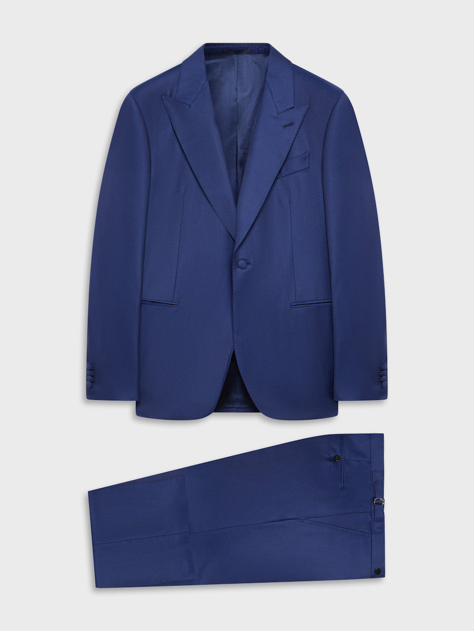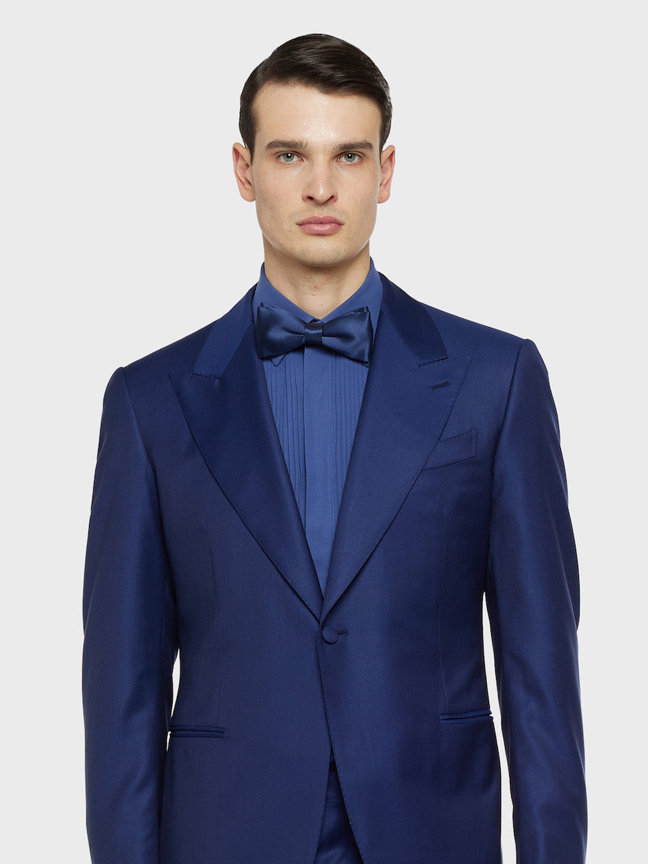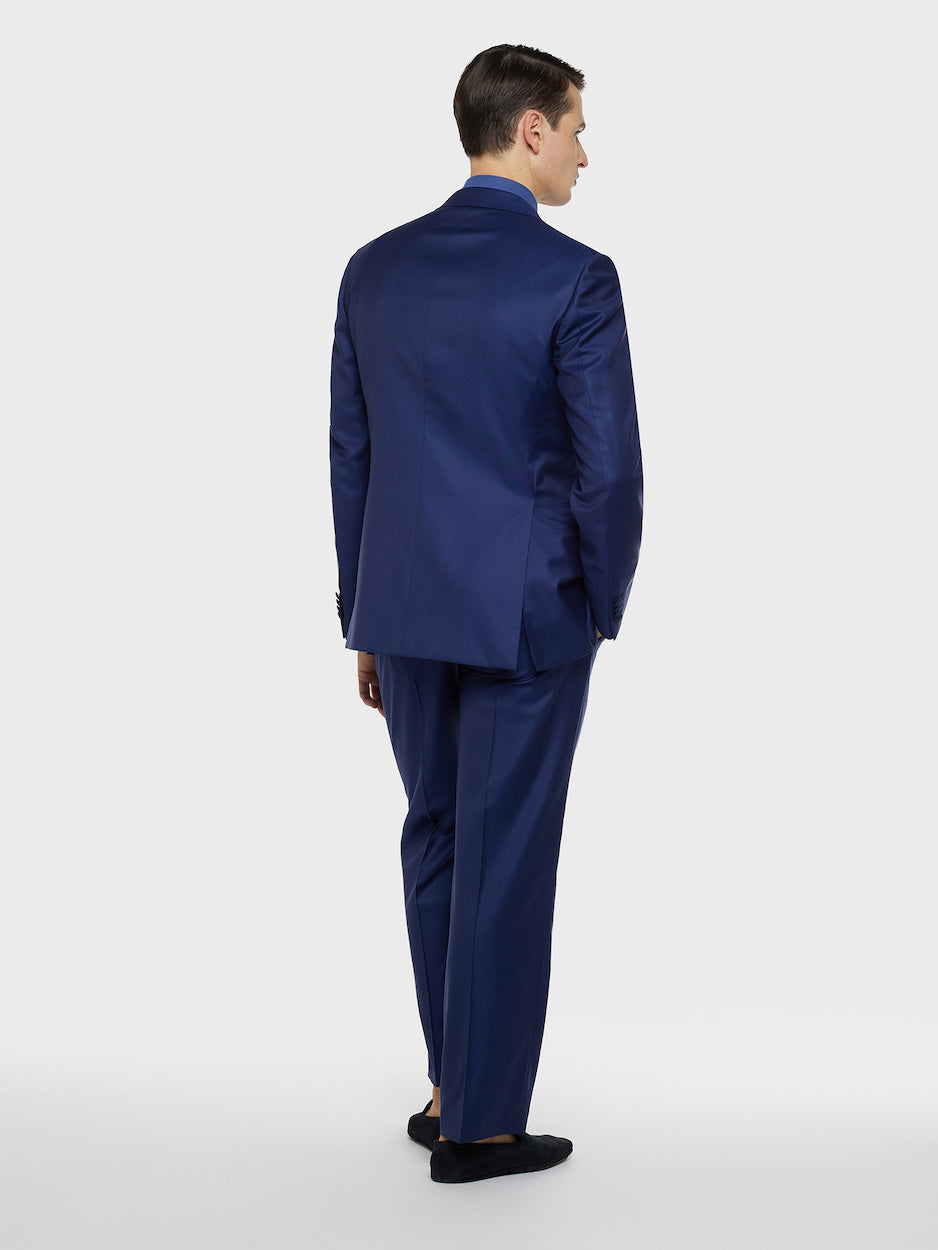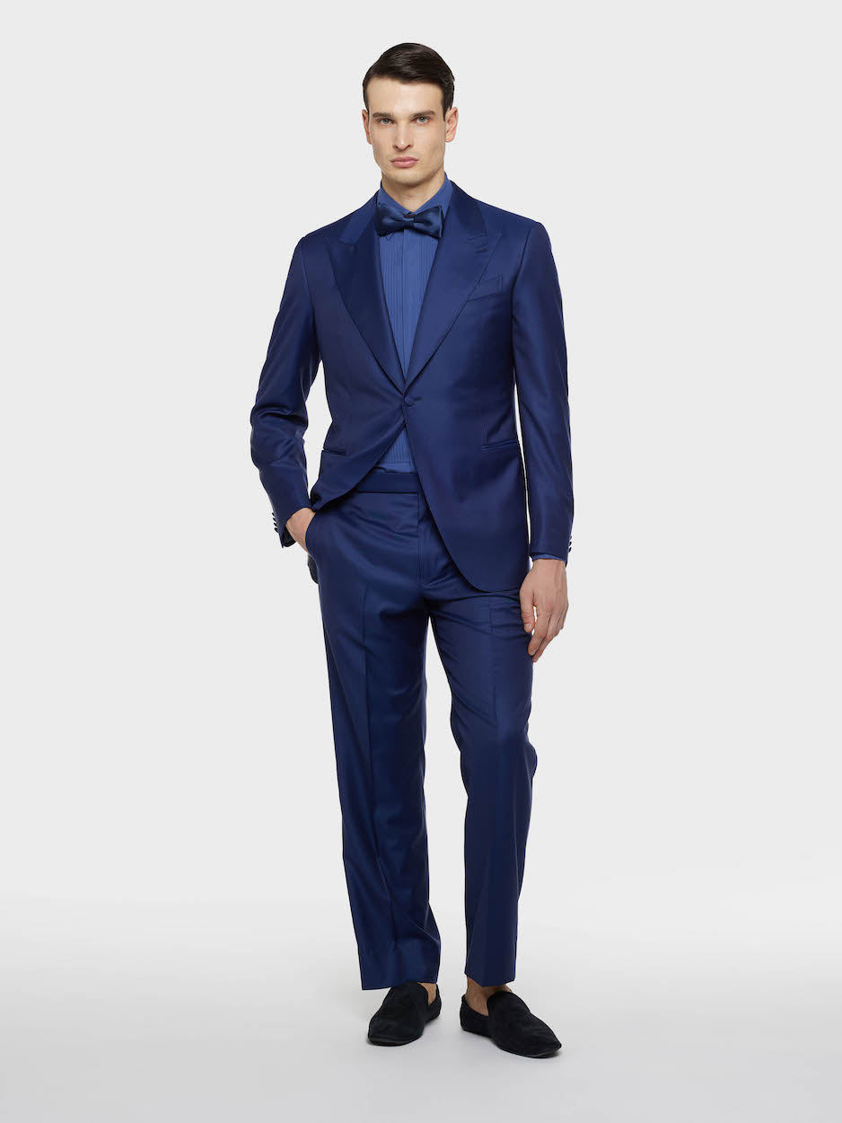 Il nostro abito Carmen dall'attitude mascolina che strizza l'occhio al fashion. Proposto nella versione monopetto con rever a lancia e tasche a filetto su pantalone con una pince dal taglio classico, per uno stile formale e raffinato. Spalla insellata con leggera sigaretta per una silhouette strutturata. In prezioso blend di lana 170's e seta Royal Wish color blu dalla mano morbidissima e preziosa. Abbinalo a una camicia bianca per un look formale e sofisticato.