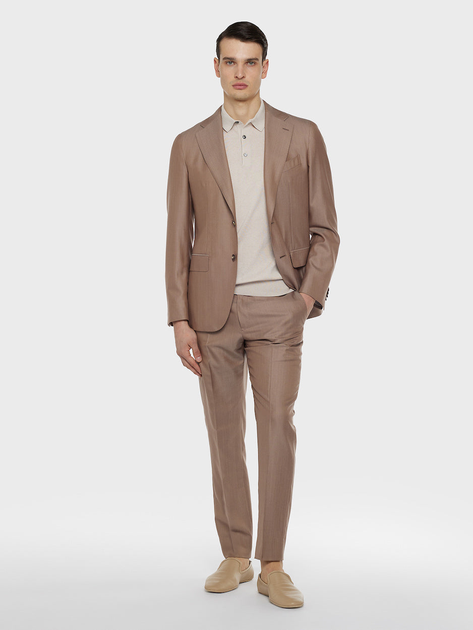 A must-have for every occasion. Short-sleeved polo with ribbed collar, hem, and cuffs. Solid beige in cotton. Perfect as an underlayer and for layering in spring looks.