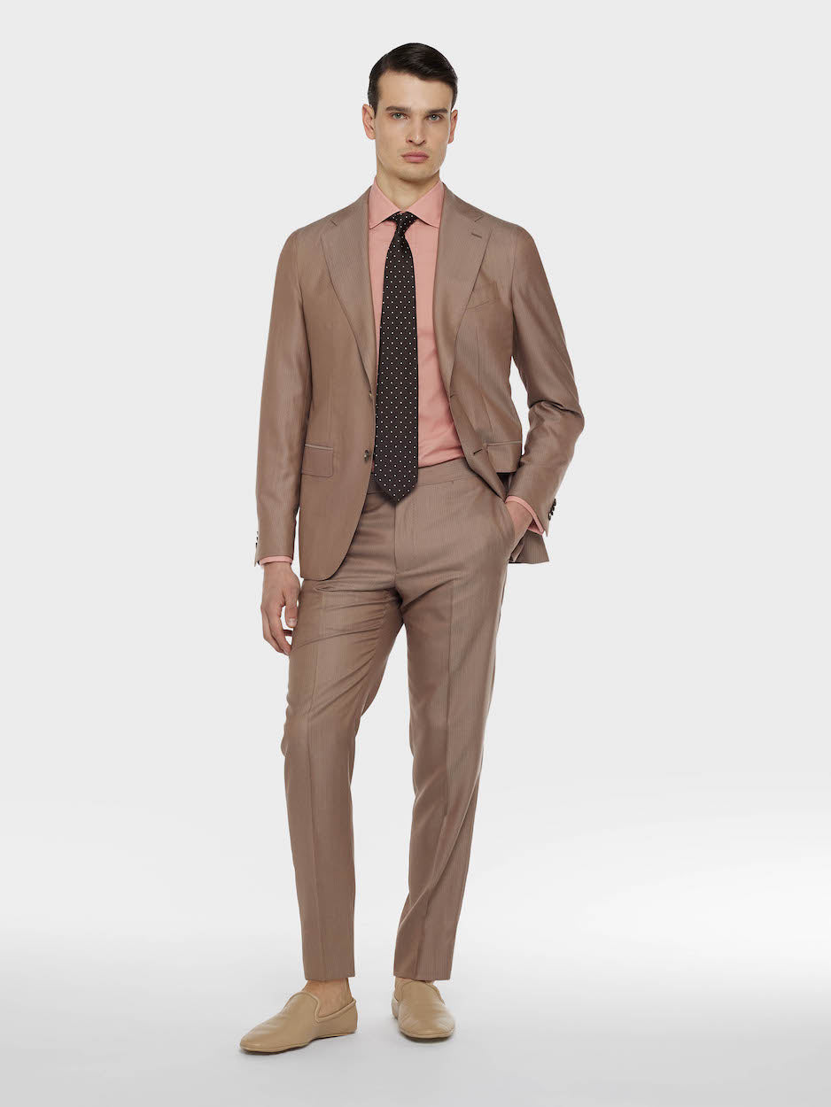 Formal shirt with French collar, Australian mother-of-pearl buttons and exclusive dual-purpose cuff, with button or cufflinks. Solid pink in soft cotton muslin. Ideal for a sophisticated look with a tone-on-tone suit.