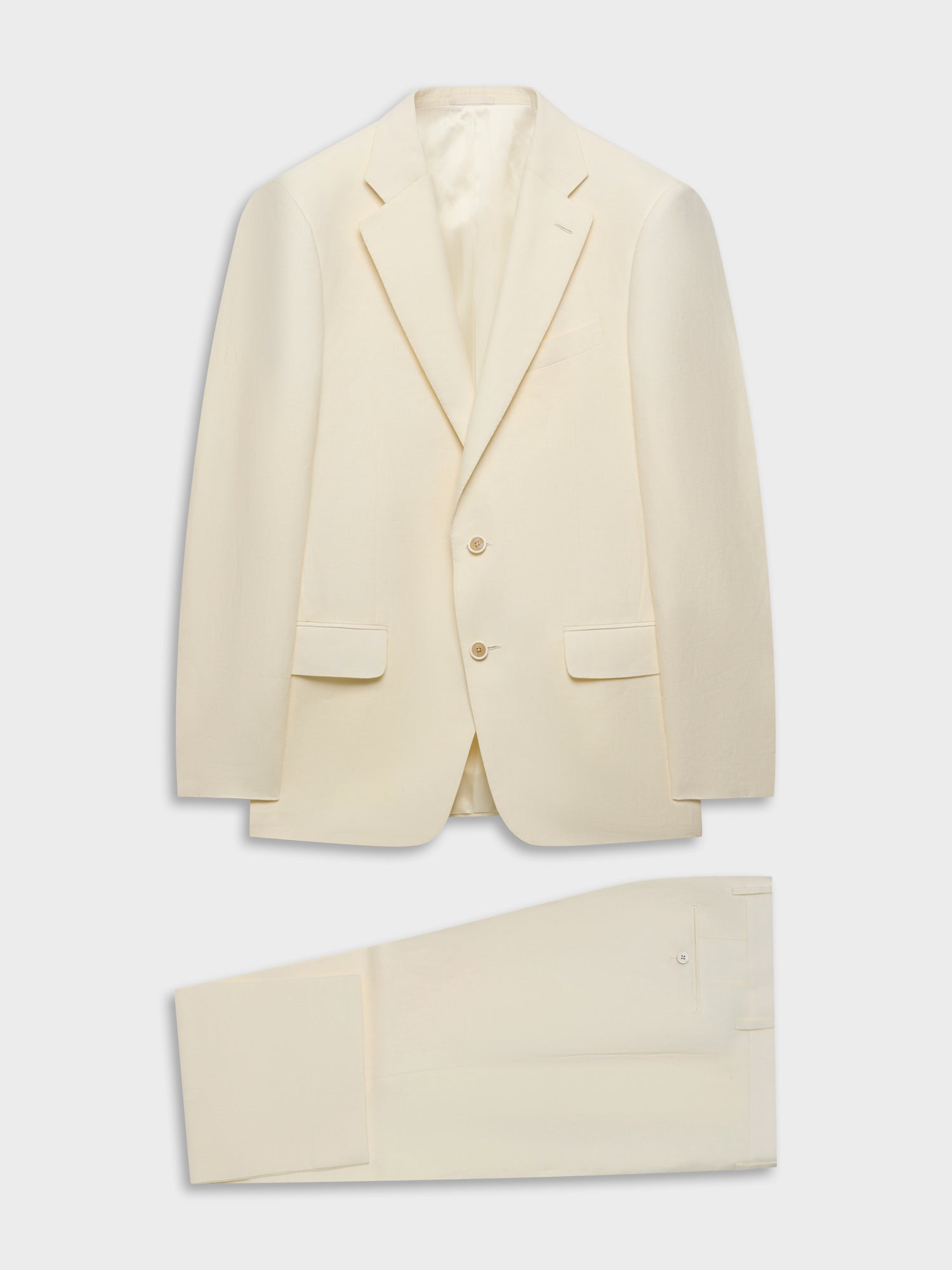 La nostra giacca Macbeth, dall'attitude formale ed elegante, proposta qui nella sua versione estiva monopetto in puro lino. Giacca Macbeth monopetto, due bottoni con tasche a pattina e spalla dritta con tromba manica piatta su pantalone classico. Realizzata in puro lino color latte dalla mano fresca e naturale. Abbinala a una camicia bianca per un look estivo sofisticato.